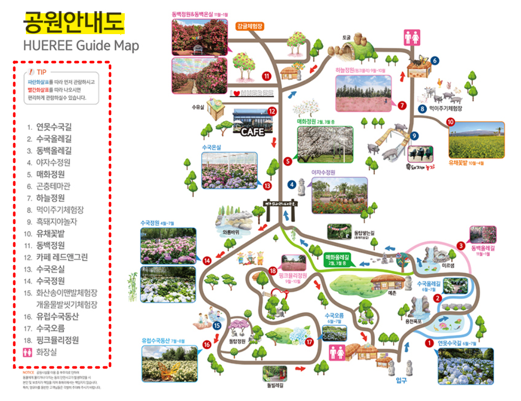 이 시기는 제주 수국이 본격적으로 피기 시작하는 시점으로, 조생종부터 유럽 수국, 여름 수국까지 순차적으로 개화합니다. 따라서 언제 방문하더라도 다채로운 수국의 풍경을 즐길 수 있으며, SNS에서 유명한 포토존도 각 구간에 나눠 배치되어 있습니다.
