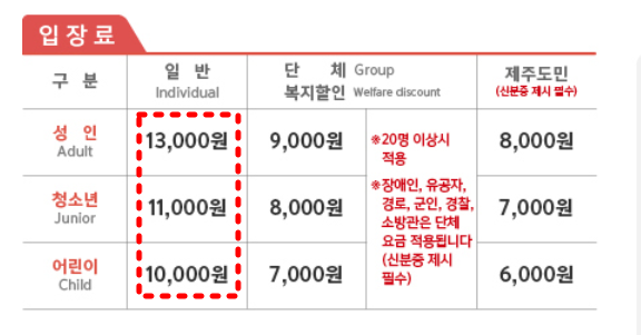 - 제주도민 할인: 성인 10,000원 / 어린이 7,000원 (신분증 지참)