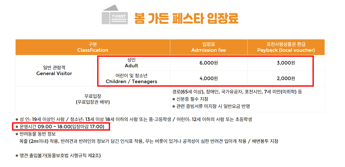 입장료는 성인 6,000원, 청소년 및 어린이 4,000원이며, 포천시민, 65세 이상, 국가유공자, 장애인 등은 무료로 입장할 수 있습니다. 특히 성인 기준 입장 시 3,000원 상당의 포천사랑상품권 환급 혜택이 주어져, 지역 내 식음료나 체험 비용으로 활용할 수 있어 가성비 높은 여행을 원한다면 더할 나위 없는 기회입니다.